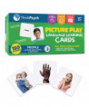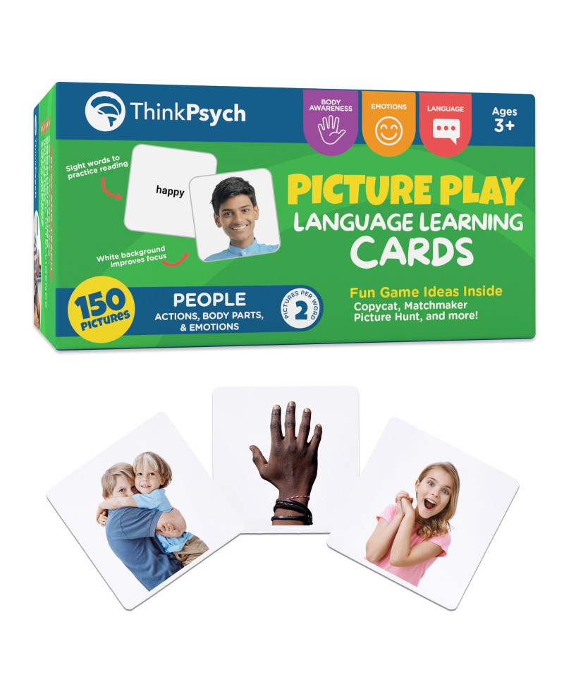 The ThinkPsych Picture Play Language Learning Cards are a fun and effective way to build essential speech and language skills in young learners. Designed by U.S. psychologists and BCBAs, this premium 150-card set features real photos of diverse children and adults from around the world. With 75 words and two examples of each—covering people, body parts, actions, and emotions—these cards help children generalize concepts and build lasting understanding. Perfect for ages 3 and up, they are ideal for speech therapy, special education, and at-home learning. Each card is thick, laminated, and easy to clean—safe for toddlers and durable enough for years of play. The included storage box with tabbed dividers makes sorting and organizing a breeze. Kids will stay engaged with fun, interactive games while learning critical language, social, and emotional skills. Whether your child is neurotypical or has autism, ADHD, or sensory needs, these cards are designed to support every learner.