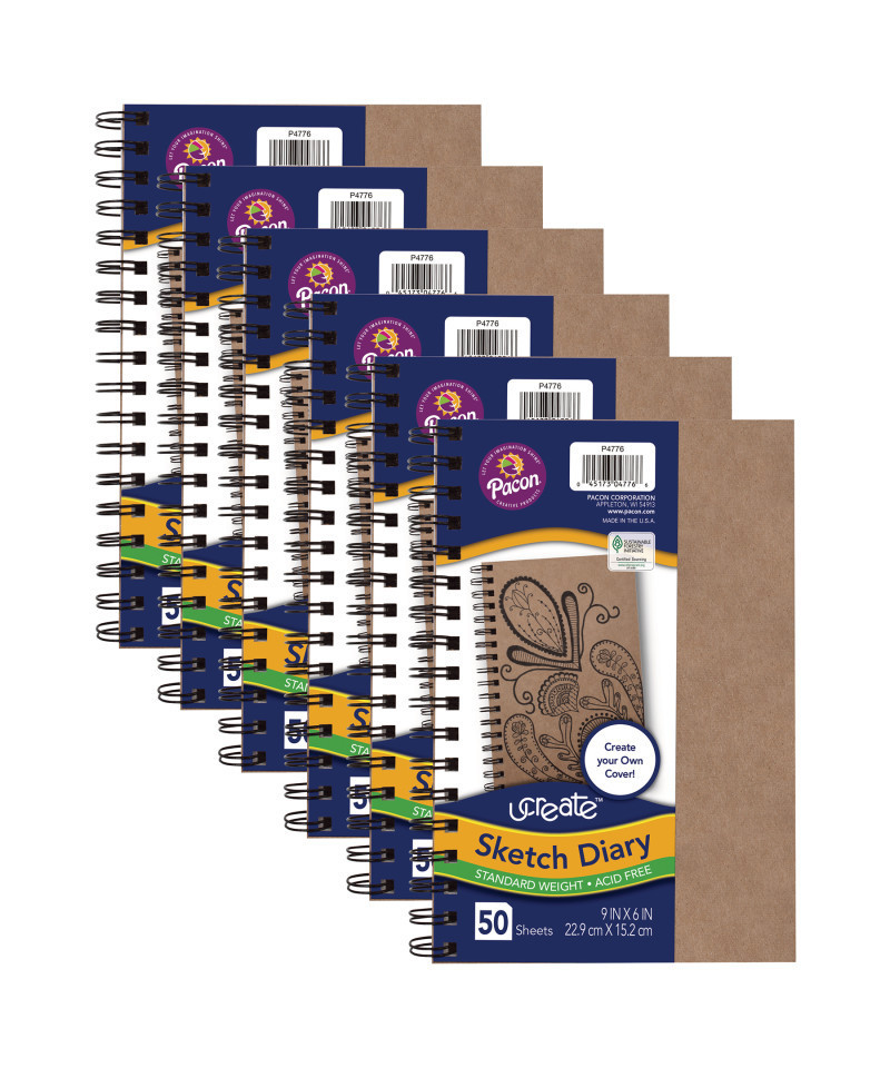 Sturdy Natural Kraft chipboard cover and back make this versatile sketch diary fun to decorate and personalize with metallic pens, markers and gel pens. Standard weight White drawing paper inside is perfect for teens, students and young adults. Acid free. Recyclable. Measures 9" x 6". Includes 50 sheets. Sold as 6 diaries.