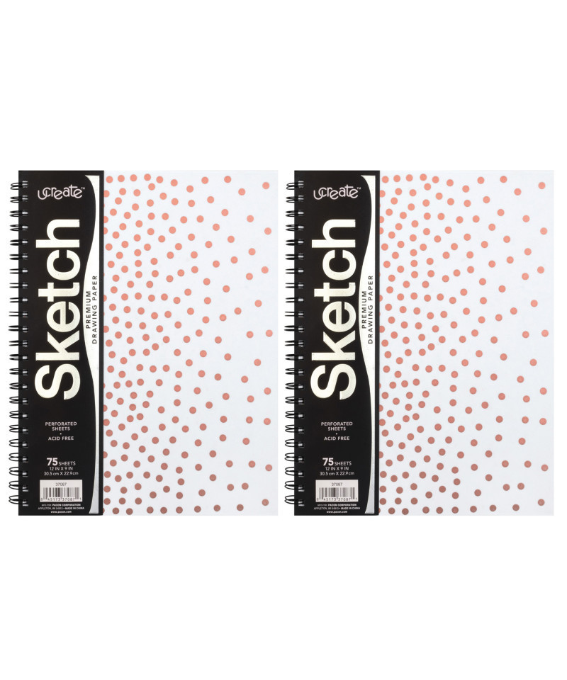 Let your imagination soar with this Rose Gold Dots fashion cover sketch book! Premium sketch book with durable front and back poly covers adorned with cascading rose gold dots. Each sketch book contains 75 sheets of 70 lb heavyweight, acid free drawing paper. Measuring 12 x 9 inches, it's easy to take your art and creativity on the go! The spiral binding lies flat for comfortable drawing and sketching. This is the ideal book for sketching and drawing with all types of dry media, such as pencils, colored pencils, pens, and marker art. Sheets are perforated for final art. Perfect school supply for teachers and students. Sold as a pack of 2.