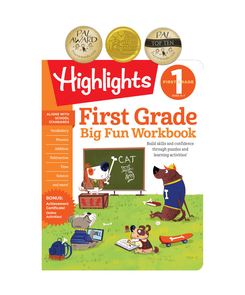 - With over 250 pages of fun puzzle-based activities including Highlights™ Hidden Pictures®, first graders will practice a variety of skills in subjects like language arts, math, and science through exercises that will boost their confidence and supplement what they're learning in school.