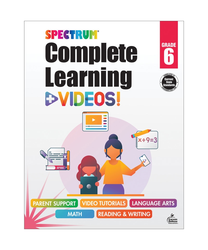 Spectrum's Complete Learning + Videos Grade 6 Workbook will help your child navigate through sixth grade and give you the tools you need to make sure your child learns everything they need to know for future math, reading, and language arts success. This innovative sixth grade workbook features lessons and activities that focus on math, reading, and language arts, as well as instructional videos to help strengthen skills needed for future academic success. Each chapter features chapter introductions that focus on the what, why, and how of each lesson, with standards-based drills and skill practice. A QR code is available to scan after each lesson, linking to a free video that reinforces each topic—a great tool for visual learners. Parents love using this workbook for added practice from home, and teachers love to incorporate the reading, ELA, and math book into hands-on lesson plans and activities—tracking student progress with the answer key in the back of the 6th grade workbook. For more than 20 years, Spectrum has provided solutions for parents and teachers who want to help their children get ahead and exceed learning goals. Spectrum supports your child's educational journey every step of the way.
