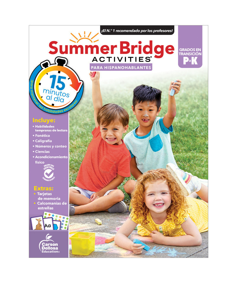 Prevent summer learning loss and prepare your child for back-to-school success in just 15 minutes a day with engaging activities, exercises, fun games, and more that help teach Spanish-speakers English – all in one workbook with Summer Bridge Activities Spanish Workbook! This Spanish book helps preschoolers - kindergarteners keep their skills sharp while learning English during the summer months to stop summer slide through fun practice pages and activities, covering math, science, reading, writing, social studies, fitness, and more. Students practice phonics, handwriting, counting numbers, hands-on science experiments, and other engaging topics, with both activities and directions in Spanish. This Spanish workbook for kids includes flash cards, stickers, and a completion certificate, and features a skill matrix and answer key to track student progress. Each page is numbered by day so kids and parents can track progress and reach monthly learning goals.