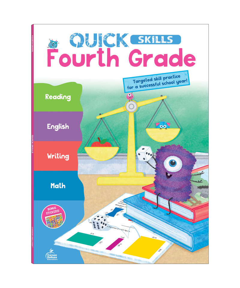 Support your child's education with Carson Dellosa's Quick Skills 4th Grade Workbooks All Subjects that help prepare your 4th grade student for 4th grade math, language arts, reading comprehension, and writing success. All Subject 4th grade books are a great way for children to practice essential skills such as geometry, parts of a sentence, handwriting practice, and more through focused practice. Identifying main idea & details in a story or passage, rounding numbers, and estimating are a few of the topics that are included in the ELA & math workbook to help inspire learning in your child's homeschool curriculum or classroom curriculum. The 80-page workbook is sized at about 7.75" x 10.6"—giving your child plenty of space to complete each exercise. The workbook includes an answer key to track student progress as well as a sheet of stickers to reward your 4th grade student on a job well done after completing activities.