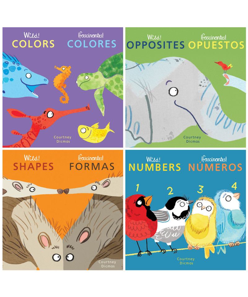 Courtney Dicmas introduces babies to basic concepts with her award-winning charm and humor. In Opposites, interactions between animals with drastically different characteristics provides plenty of opportunities to discuss and make comparisons. Colors takes an original approach to the topic by representing popular colors through ocean creatures. Shapes cleverly demonstrates the way that different shapes appear in nature, through the outlines of animals, or through the negative space between them and their family members. How many birds can roost on a wire? Find out in the final book in the series: Numbers! Each bilingual book has 14 pages.