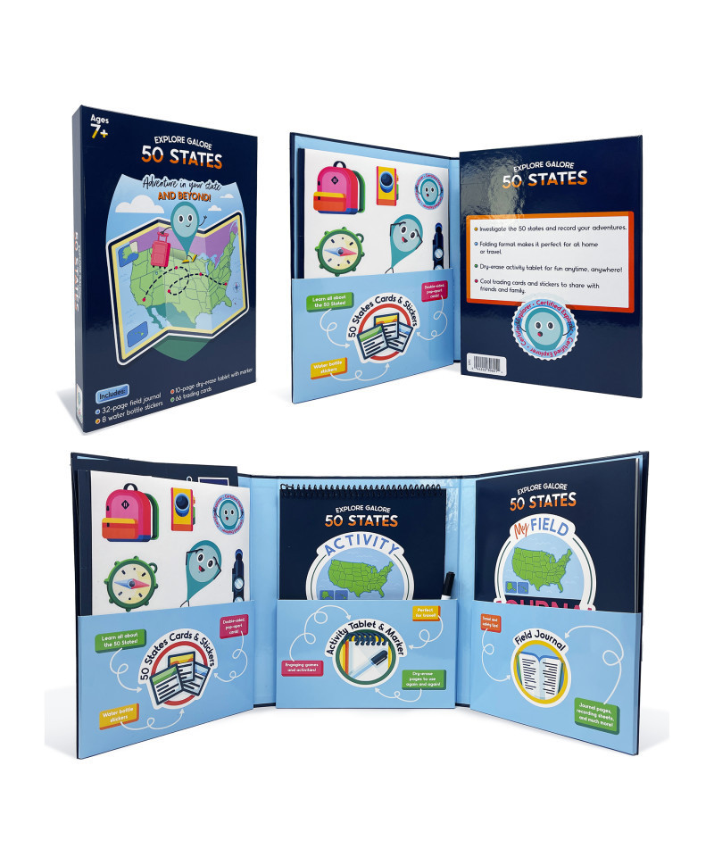 Investigate your world and beyond with Carson Dellosa's Be Clever Wherever Explore Galore: 50 States Wipe Clean Activity Book! Activity books for kids are a great way to teach kids all about US states and territories with fun summer learning and road trip activities that are both fun AND educational. This dry erase activity book set includes a wipe clean activity book a dry erase marker, a 32-page field journal, 66 trading cards, and 8 water bottle stickers for versatile learning fun. Learn all about US geography while playing I Spy games, completing dry erase activities, and more in the activity book, while recording things you've seen, learned, and experienced about your adventures along the way in the field journal. You'll even learn fun facts with the US geography flash cards, too! Perfect for at home or travel, this kit has everything your child needs to get ready for their next adventure, whether its in near or far! Practice, learn, and play during long road trips, downtime during the summer, and more.