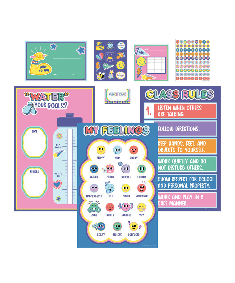 Classroom management is made easier with Carson Dellosa's We Stick Together Behavior Management Classroom Supplies! The 107-piece set includes everything you need to display class rules and goals, reinforce social emotional learning skills with a calming corner feelings chart, track student progress and behavior with incentive charts and punch cards, and reward students for a job well done with motivational stickers and award certificates.