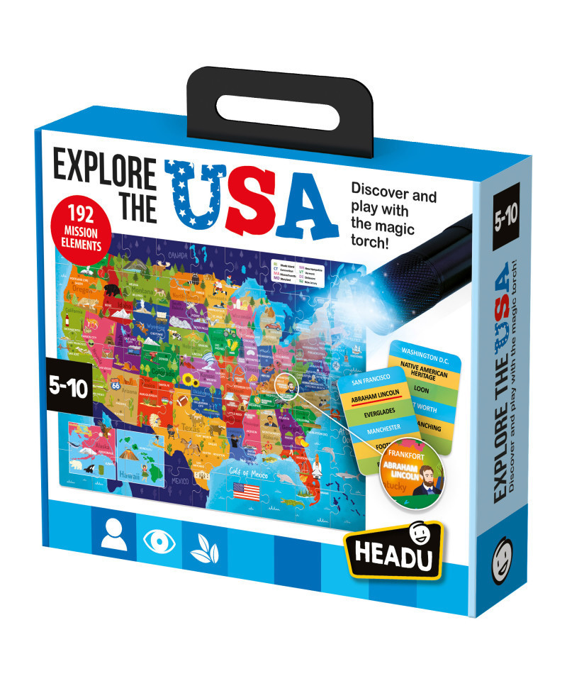 Embark on an exciting journey across the country with the Explore the USA Puzzle! This interactive puzzle helps children discover the geography, cities, and cultural landmarks of the United States in a fun and engaging way. As they assemble the map, kids can locate major cities and then use the included magic torch to reveal famous monuments, native wildlife, and other fascinating aspects of American culture. Designed in collaboration with teachers and education experts, this high-quality educational toy supports geography learning while sparking curiosity and exploration. Made in Italy with safe, durable materials, it’s a perfect way to bring the wonders of the USA to life! Includes Puzzle (63-piece, 47 x 37 cm), 16 double-sided mission cards, 1 magic torch (requires 3 x AAA batteries, not included), 1 hourglass and rules.