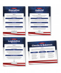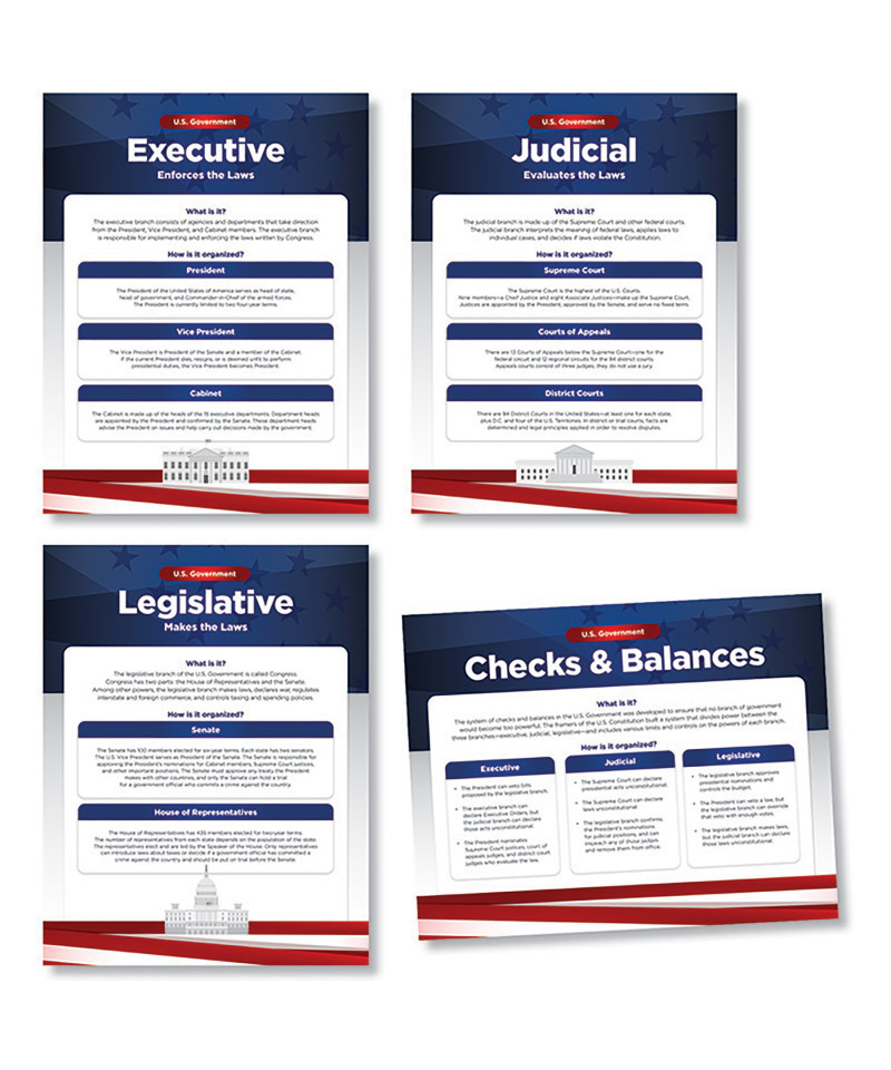 Provide students a general overview of the U.S. Government with this set of four 17″ x 22″ (43.2 x 55.9 cm) posters. Three posters explain the branches of government, while the fourth focuses on the checks and balances set forth by the U.S. Constitution.