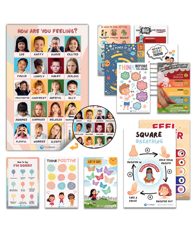 Help children build emotional intelligence and social skills with the ThinkPsych 12 Feelings & Life Skills Posters, the ultimate bilingual poster collection designed by psychologists. This engaging set includes 12 double-sided posters featuring English on one side and Spanish on the other, making them accessible for diverse classrooms, therapy settings, and homes. Each 11x17-inch poster uses real photos of kids to help children identify and relate to 20 different emotions—no confusing emojis here! The collection goes beyond emotions, teaching practical coping strategies, social skills like friendship and communication, and important life lessons to support emotional resilience. Crafted with commercial-grade lamination, these posters are built to withstand daily use and resist rips, spills, and tears. Whether you're a teacher, therapist, or parent, these posters are a powerful, ready-to-use tool to boost emotional wellbeing and communication. Make your calm down corner or SEL curriculum more effective with ThinkPsych—where social emotional learning is made easy.