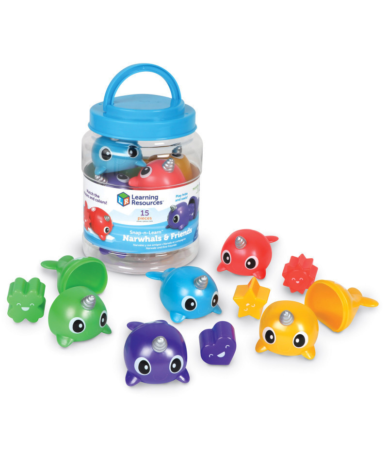 Another addition to the popular Snap-n-Learn line of toys! Narwhals and hide-inside shape friends (happy heart, smiley sun, lucky clover, and more!) help kids learn colors, build fine motor skills, and develop their imaginations. Match the bright pieces by color or shape, or mix ‘em up and play! Set features 5 two-piece narwhals and 5 shape friends in 5 colors, for 15 pieces in all. Narwhals measure 4"L x 2.25"H.