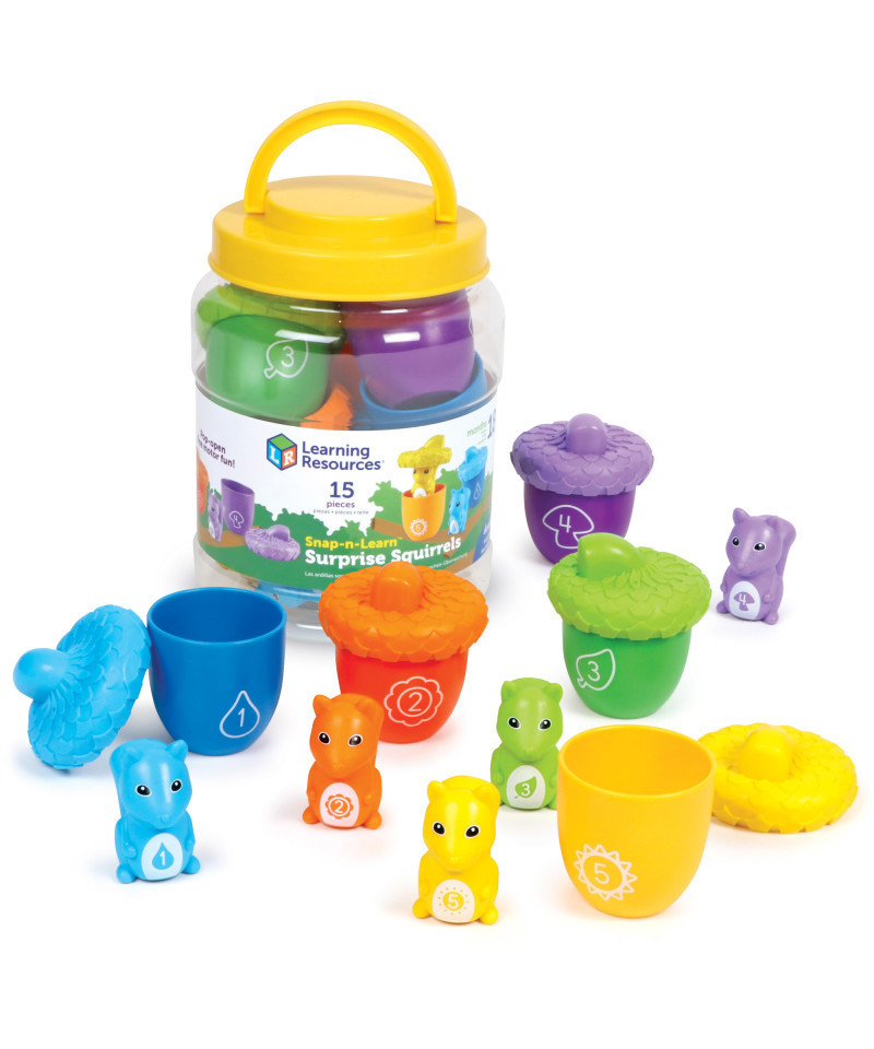 An all-new take on our classic Snap-n-Learn™ sets! Pop open the 5 textured acorns, discover the surprise squirrels, and start building shape, color, number, and matching skills. Squirrels double as finger puppets for fun imaginative play. Reusable bucket doubles as easy storage. Assembled acorn measures 3"H x 2.75"W.