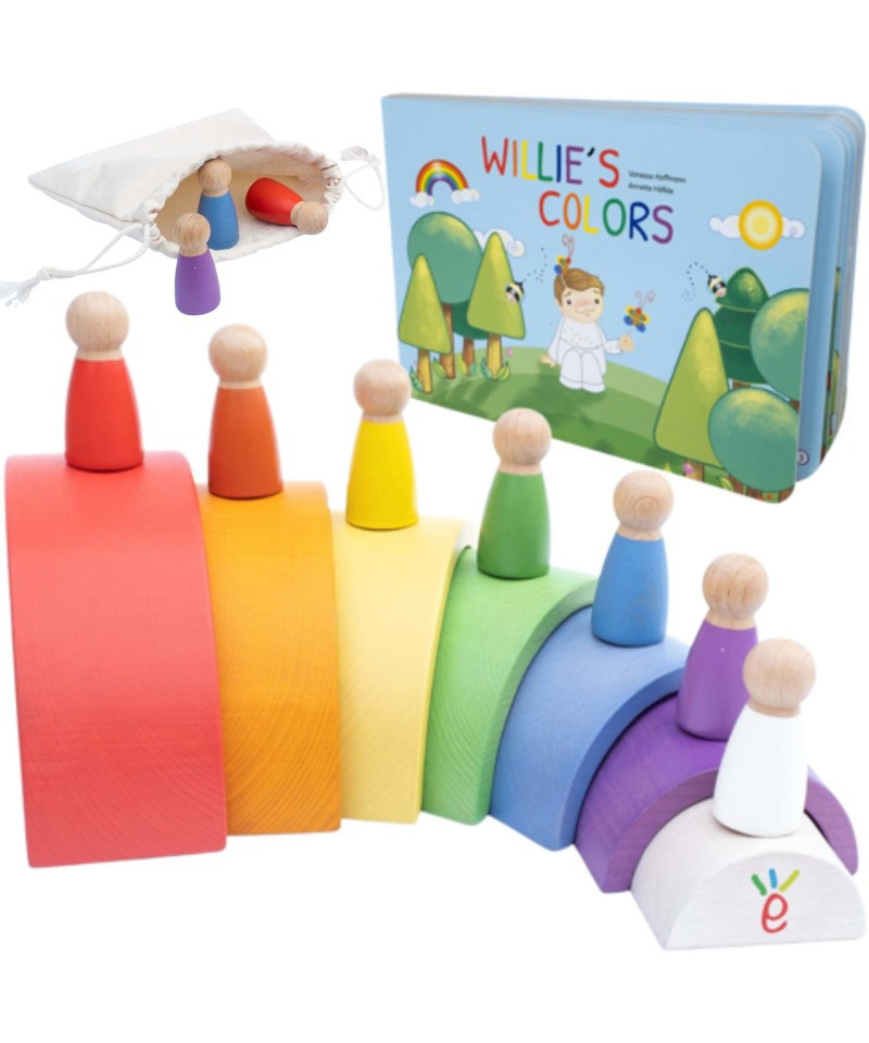 INSPIRES CREATIVITY AND EMOTIONAL INTELLIGENCE: The wooden rainbow stacking game offers endless ways of building with the blocks and peg dolls. The story of the educational book "Willie's colors" fosters playfully your kid's emotional intelligence!