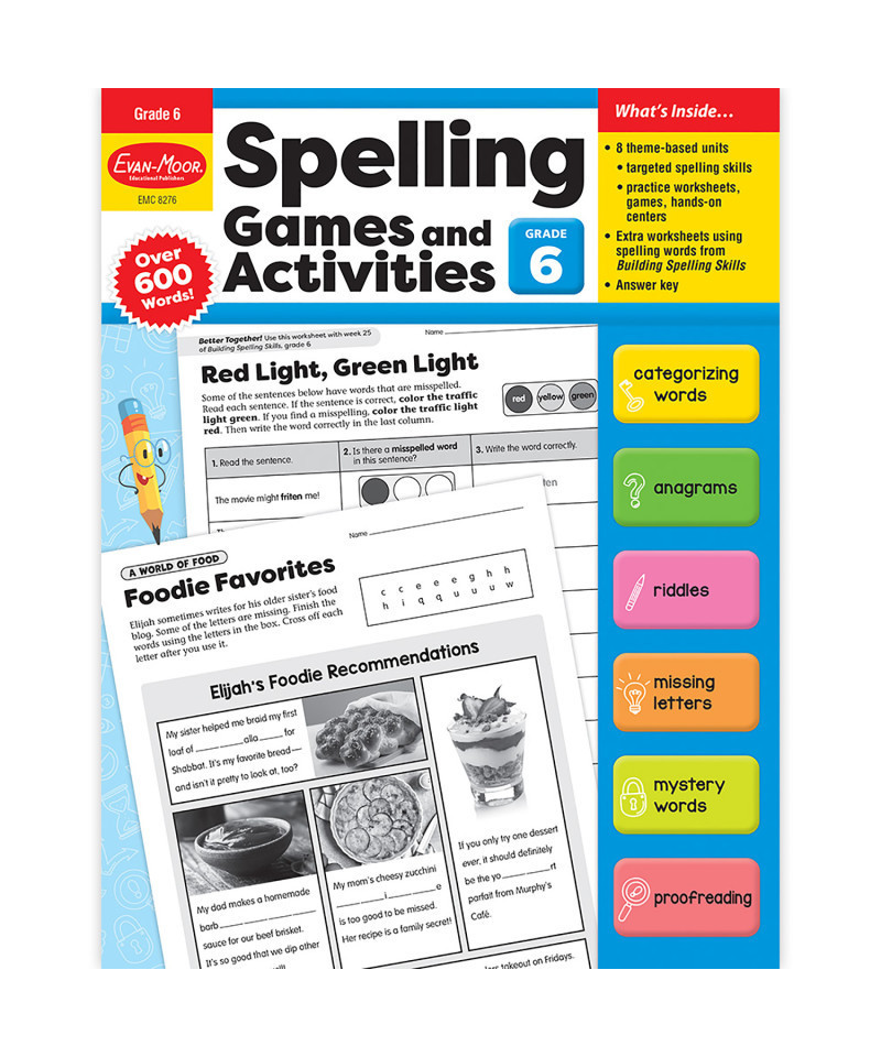 - Spelling Games, Grade 6 contains worksheets with real-world themes that engage students in spelling words and using critical thinking skills.