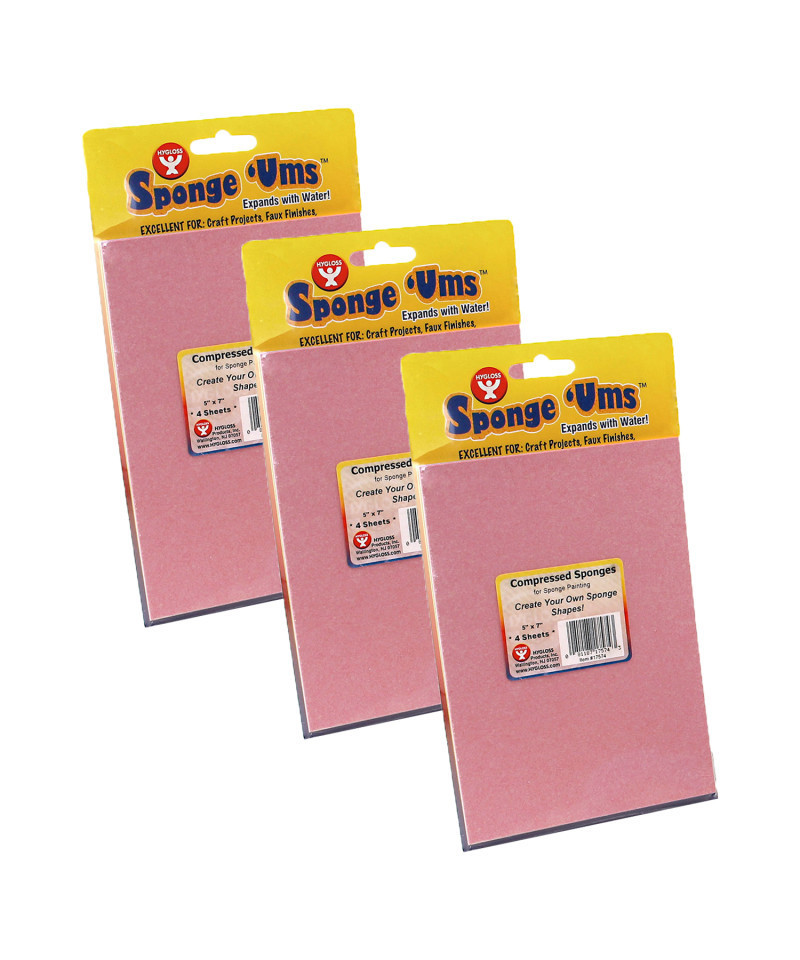 Use Compressed Sponges by Hygloss when you want great quality, highly resilient craft sponges that you can cut into any shape or object. Craft sponges can be used for sponge painting on walls, making borders, designing t-shirts and more. Each compressed sponge sheet measures 5" x 7". Each pack includes 4 sheets. Sold as 3 packs for a total of 12 sheets.