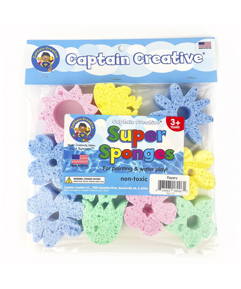 Captain Creative Super Sponges are a fun and functional addition to any classroom, art room, or play space. Made in the USA from high-quality, real cellulose material, these durable sponges are 1" thick and perfect for sponge painting, sand and water tables, and water play. The Flower Pack includes a variety of die-cut shapes, with variations in color and quantity that make each set unique—while still delivering consistent quality and value. Designed for creative exploration, these sponges are not recommended for children under 3 years old, and adult supervision is advised for safe, engaging play.