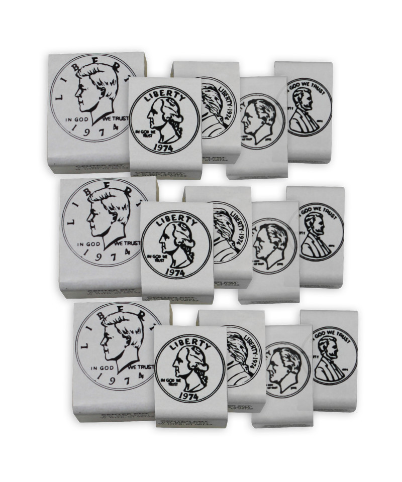 - COIN STAMPS -- Sold as 3 sets, each set includes 5 wooden stamps with detailed rubber imprints of the heads side of the penny, nickel, dime, quarter and half dollar.