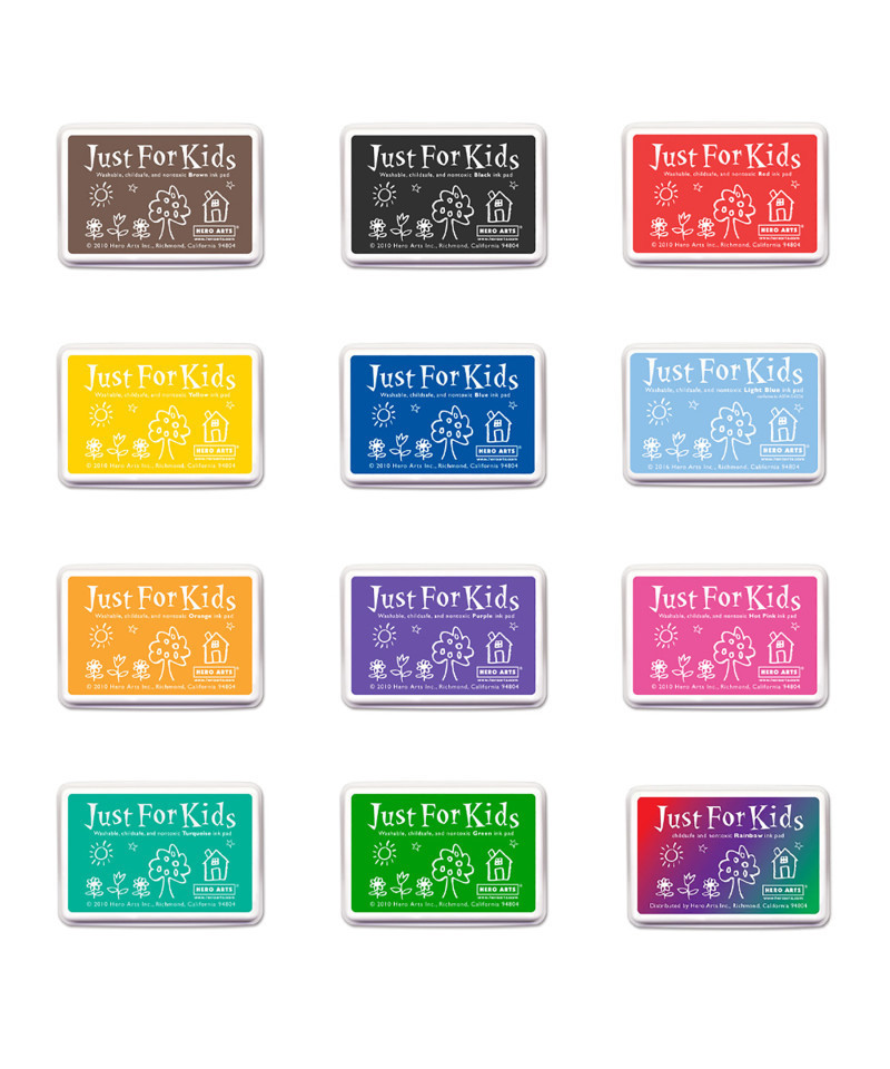 Child-safe inks are ideal for younger stampers as they are water-based, kid-safe and non-toxic. The impressions fade into the paper and work best on non-glossy surfaces. A colorful collection featuring 12 full sized ink pads from our best selling Just for Kids Ink line. Includes one of each of the following: