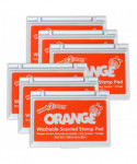 This orange stamp pad contains ink which smells like oranges. The non-toxic ink dries quickly when stamped and is fade resistant and acid-free for archival quality. The ink presents crisp, vivid images when stamped. A multisensory addition to arts and crafts time, scented stamp pads offer a variety of creative possibilities. The raised pad means there are no hard edges around the ink. Children can press down without hitting an edge, which provides more area for stamping! Stamping is a fun way to develop fine motor skills and foster creative expression. The ink pad is packaged in a plastic case with flip cover to prevent it drying out. For ages 3+. Size of ink pad: 3.5"L x 2.1"W. Size of entire stamp pad (with plastic casing): 3.75"L x 2.8"W x 0.6"H. Sold as a pack of 6 stamp pads.