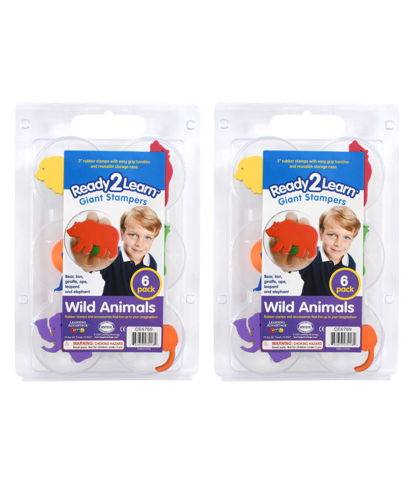 Create safari scenes and decorate DIY projects with these Giant Wild Animal Stampers! Each set includes 6 different animal-themed stamps: bear, lion, giraffe, ape, leopard and elephant. Each stamp features a large foam shape mounted on a 3" disc for stability. The chunky, rounded handles provide greater comfort and control. Ideal for DIY projects and art and craft time, these giant stampers assist in developing fine motor skills and creativity. Size: 1.9"H x 3" dia. Sold as 2 sets for a total of 12 stampers.