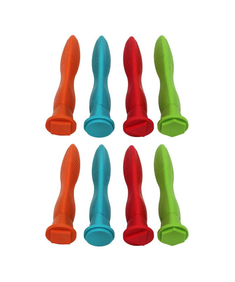Each one has a rubber handle that conforms to a child's fingers for easy holding. Builds motor skills while having fun making pictures with paint or clay. Perfect for special needs children. Each set includes four different designs: circle, square, triangle, and hexagon. Sold as 2 sets for a total of 8 stampers.