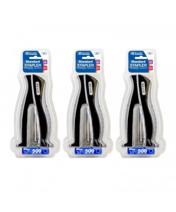 - STANDARD DESKTOP SIZE. 1 Stapler and 500-count staples (26/6) in a storage box. Staplers measure 6" x 3.1" x 1.4". Stands vertically or horizontally on desk. Soft grip design for comfortable use.
