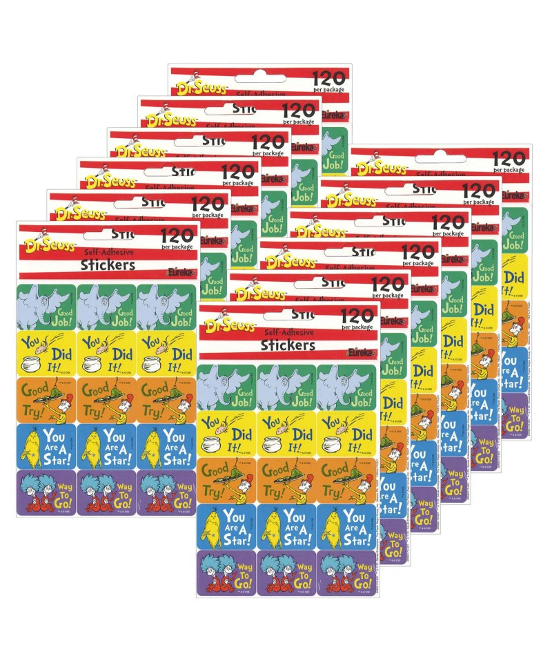 The choices are endless with Eureka stickers. There are hundreds of ways to utilize this versatile format at home or in the classroom. Each sticker measures 1 3/8" x 1". Each pack includes 120 self-adhesive stickers (24 each of 5 designs). Sold as 12 packs for a total of 1440 stickers.