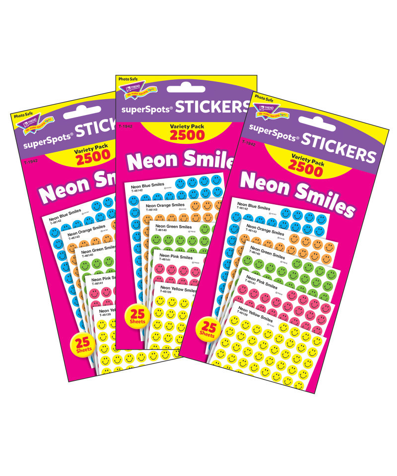 Popular superSpots pack proves variety is the spice of life! Bright colors and amazing designs to motivate, collect, trade, and celebrate success. So many uses! Acid free, nontoxic, and safe for photos. 5 colors (Neon Yellow, Neon Green, Neon Pink, Neon Blue, Neon Orange), 2500 stickers per pack. Sold as 3 packs for a total of 7500 stickers.
