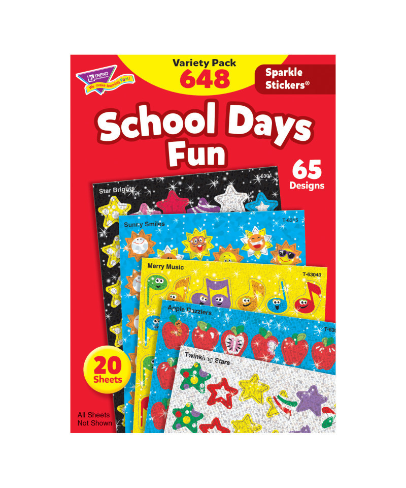 Little sparklers are a big hit with kids! They're just the right size to put on homework and reward good behavior. This variety pack includes Apple Dazzlers, Twinkling Stars, Merry Music, Brilliant Birthday, Sunny Smiles, and Star Brights. Stickers are acid free, nontoxic, and safe for use on photos. 65 designs, 648 stickers.
