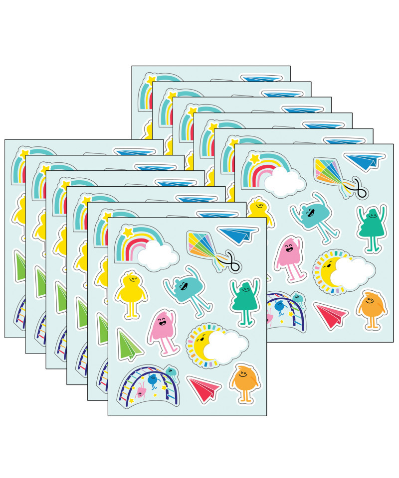 Carson Dellosa's Happy Place Shape Stickers inspire students to keep up the good work. Each pack of fun stickers includes 6 sheets that feature vibrant and cheerful shapes such as smiling people, suns, rainbows, multicolored kites, and an array of bright paper airplanes. Each sheet features 12 stickers, ranging in size from about 1-inch x 1/2-inch to 2 inches x 1 1/4 inches. Acid-free and lignin-free, these stickers are great for encouraging students and rewarding them on a job well done. Stickers are also great for scrapbooking and photo projects, enhancing assignments, goodie bag gifts, and much more. Education happens everywhere, and Carson Dellosa strives to provide the tools needed to inspire learning everywhere it happens. Each pack includes 72 kids stickers. Sold as 12 packs for a total of 864 stickers.