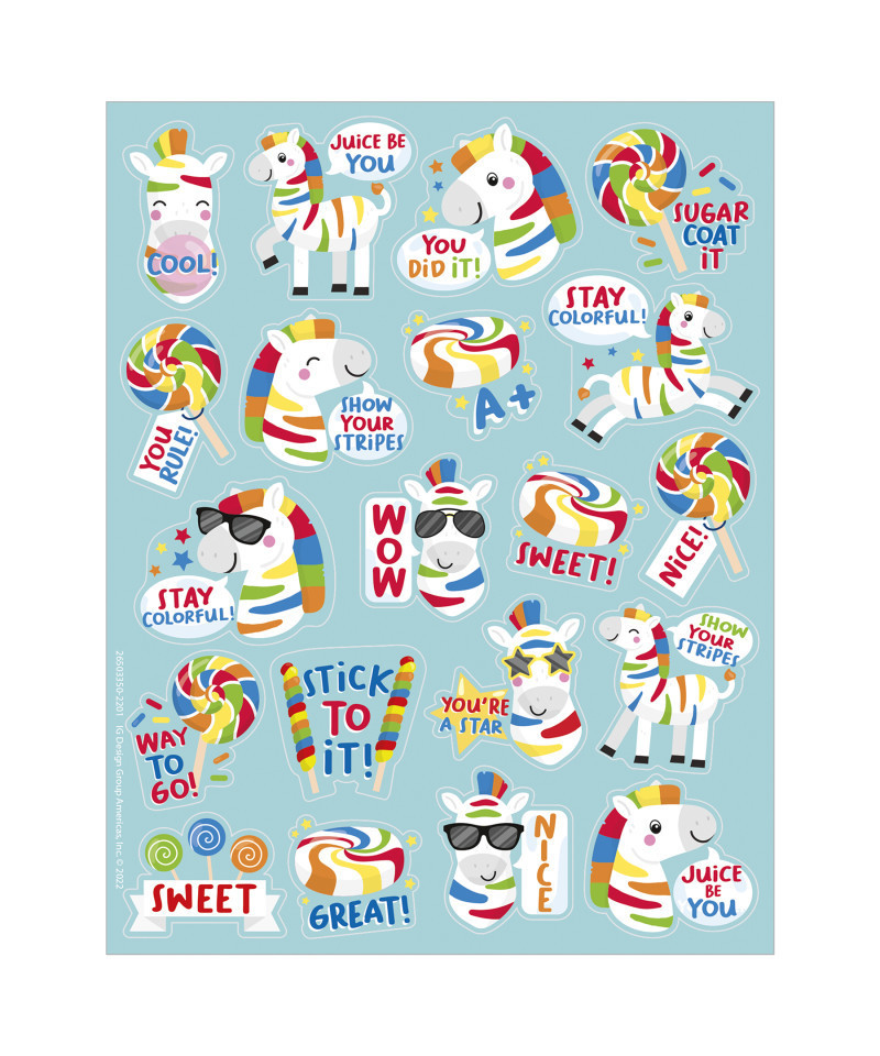 Show your stripes with these fun and colorful fruit punch scented stickers with a long-lasting smell! The playful zebra artwork is sure to be a favorite among students, teachers, and parents! Add to graded assignments, classroom crafts, letters, party invites, cards, rewards, and more! Each sticker measures about 1" in diameter. Individual sticker size varies slightly by design. Each pack includes 80 scented self-adhesive stickers.