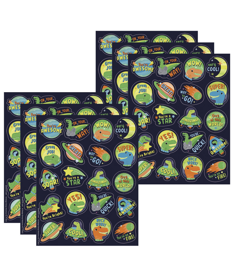 Dinosaurs galore! These fun and colorful "Dinosaur Breath" (green apple) scented stickers are sure to be a favorite among students, teachers, and parents! Features fun sticker poses of dinosaurs in space, each with a long-lasting smell. Add to graded assignments, classroom crafts, letters, party invites, cards, rewards, and more! Each sticker measures about 1" in diameter. Individual sticker size varies slightly by design. Each pack includes 80 scented self-adhesive stickers. Sold as 6 packs for a total of 480 stickers.