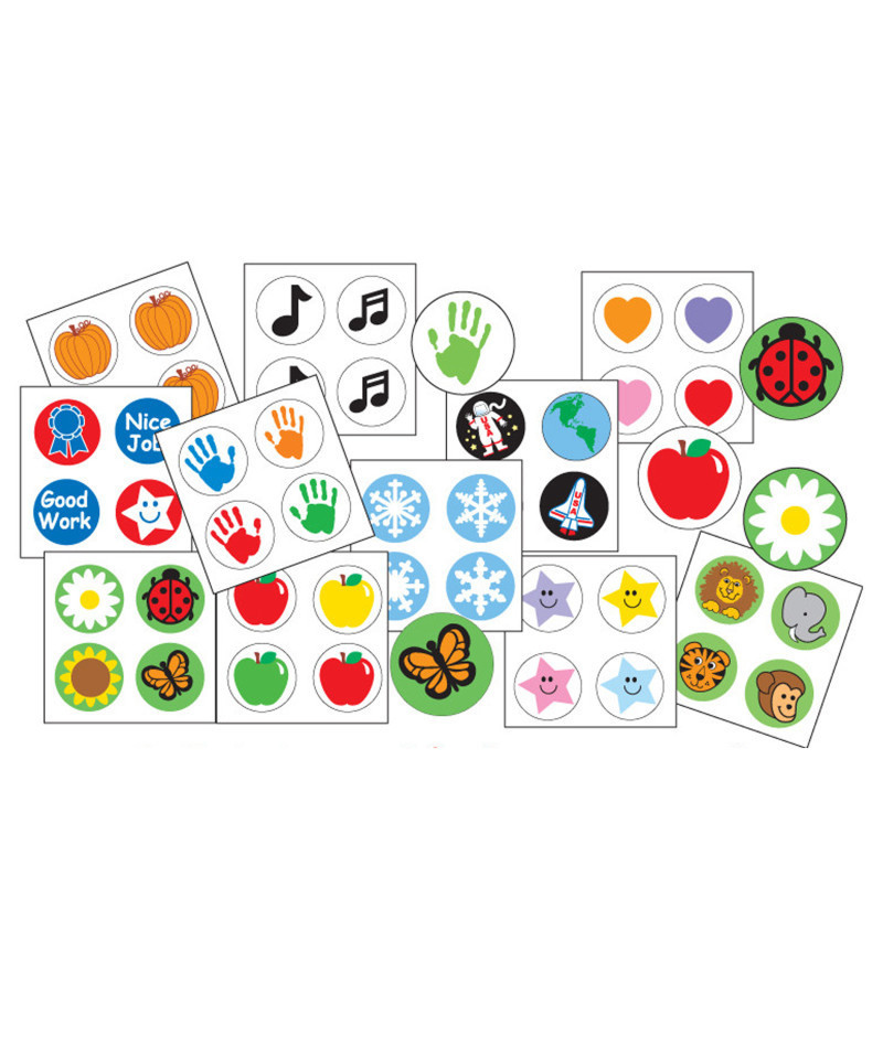 Our 2880 Incentive Stickers pack comes with 10 assorted sheets of 288 stickers for all seasons. Each sticker is approximately 3/8" each in size. Incentive stickers are a great tool for teachers and parents alike and are perfect for positive reinforcement and encouraging students in their learning. Use stickers to keep track of goals, monitor completed assignments and academic progress, mark tasks off a schedule and more. Use as rewards for a job well done, good grades, good effort put forth and more. Use stickers to decorate scrapbooks, bookmarks, add some flair to letters and envelopes, use in various crafts and decorating tasks. These stickers are great for using with Creative Shapes Etc. incentive charts and have many educational and creative uses.