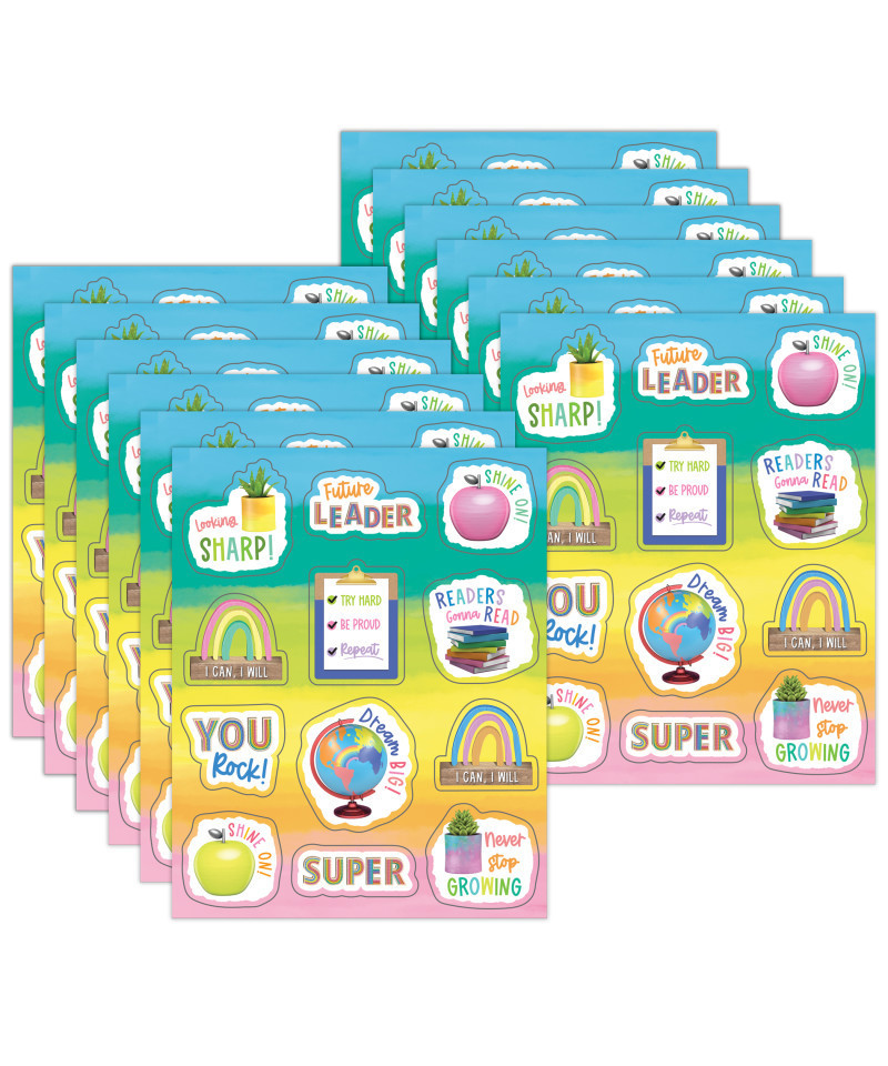 Add encouragement and positive vibes to classroom supplies, tests, projects, assignments, rewards, and more with the Carson Dellosa Creatively Inspired Motivational Stickers! Each 72-piece stickers pack features 6 sheets (4.5" x 5.62") of acid-free, lignin-free teacher stickers with 12 stickers on each sheet, featuring inspirational quotes with rainbows, apple, world globe, and succulent décor. Add the perfect finishing touch to homework, assignments, classroom supplies, and your incentive chart, or use the boho rainbow shape stickers to reward students on a job well done for completing tasks, sharing, or helping out with inspirational stickers kids will love! Reward stickers that feature inspirational messages such as "You rock!", "Future leader", "Shine on", and more are a great way to uplift and motivate students year-round. The Creatively Inspired collection, designed by Stephanie and Loreal of @HappilyEverElementary, partnered with Carson Dellosa to help create a vibrant, positive, and creative environment that inspires students to learn. Sold as 12 packs for a total of 864 stickers.