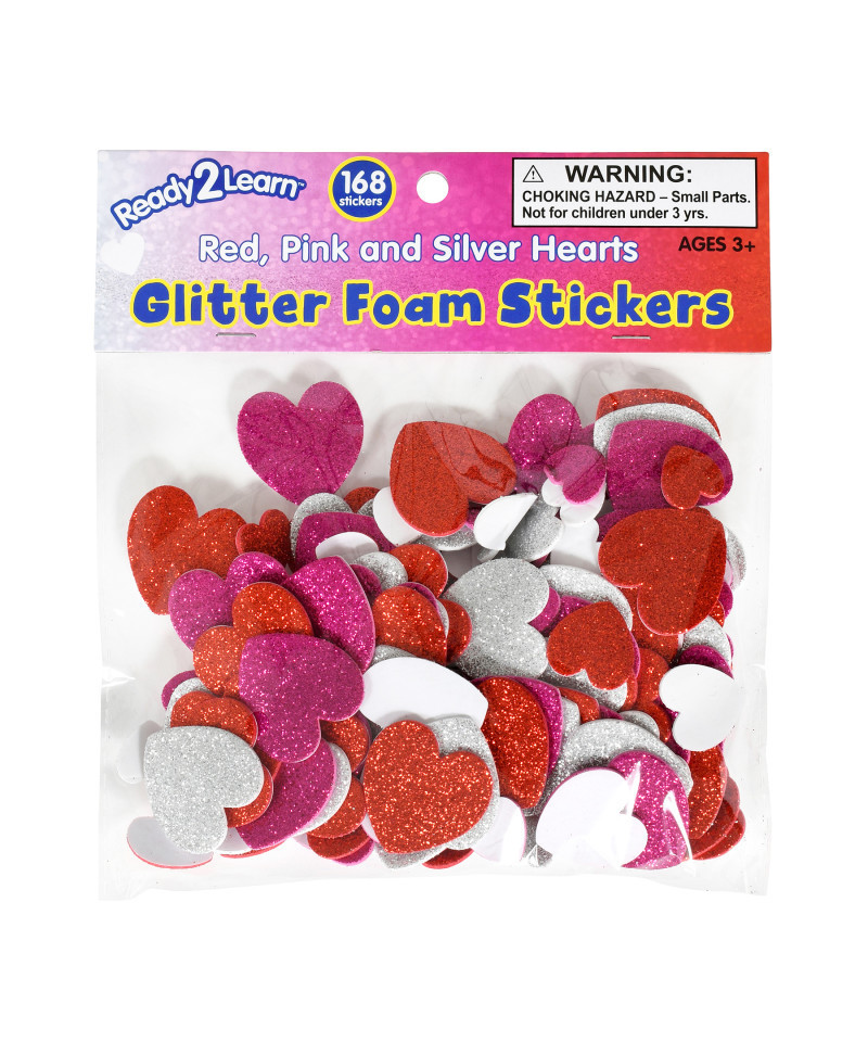 Create sparkly scenes and personalize your stuff with glitter foam stickers! This sticker pack includes 168 heart-shaped stickers red, pink and silver. The pack features 4 different sizes. These mess-free stickers don't require glue and are easy for children to peel and stick. Create sparkly scenes during craft time. Also personalize greeting cards, water bottles and scrapbooks with these durable stickers! Crafting with stickers contributes to the development of children's fine motor skills, hand-eye coordination and creative expression. These thick EVA foam stickers are easy to hold and manipulate. The stickers are non-toxic. For ages 3+. Sizes: 0.6", 0.75", 1" and 1.2"L.