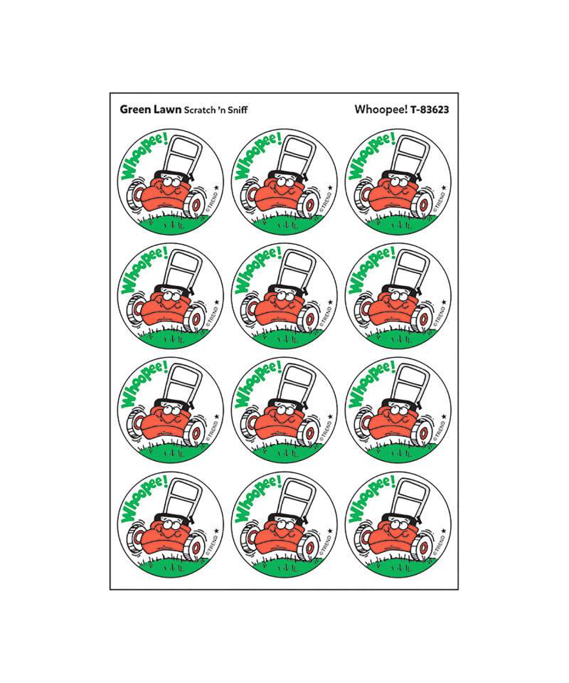 Get a whiff of this Whoopee!, green lawn-scented sticker! TREND Scratch 'n Sniff Stinky Stickers from the '80s are BACK! Fun to collect, trade, and celebrate accomplishments and special occasions. Collectors will be happy to spot the star symbol to distinguish TREND Retro Stinky Stickers from those printed in the 1980s. Each pack includes 24 stickers on 2 sheets.