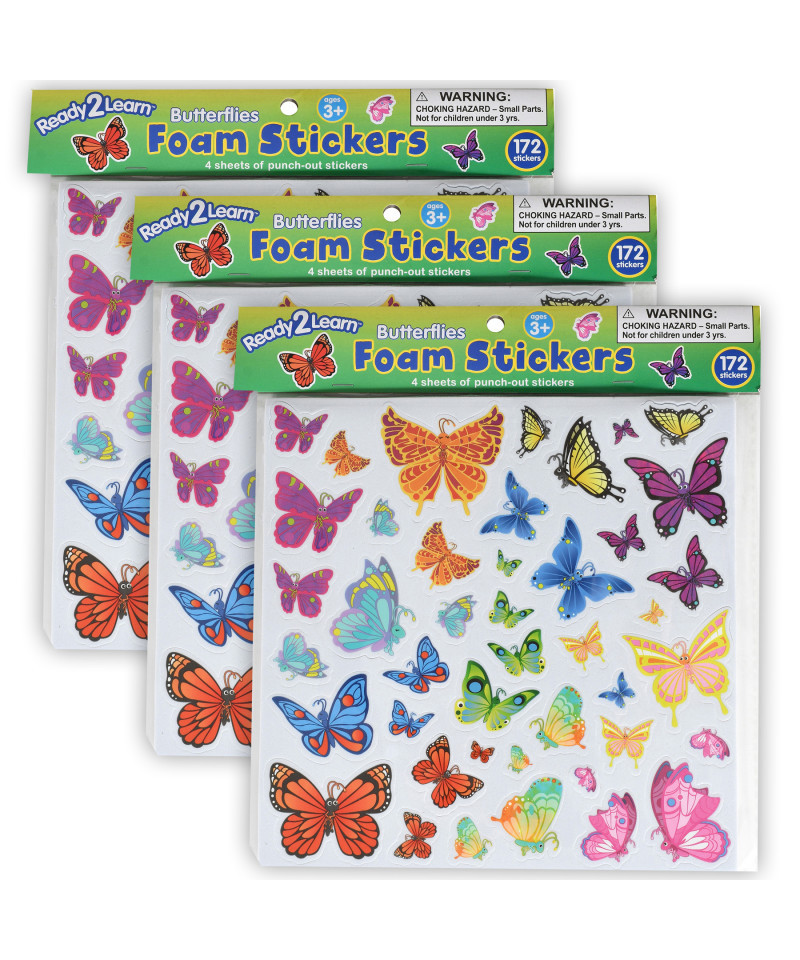 - BUTTERFLY STICKERS -- Sold as 3 packs, each butterfly-themed sticker pack includes 4 foam sheets, each with 43 punch-out stickers in 12 different butterfly-themed designs!
