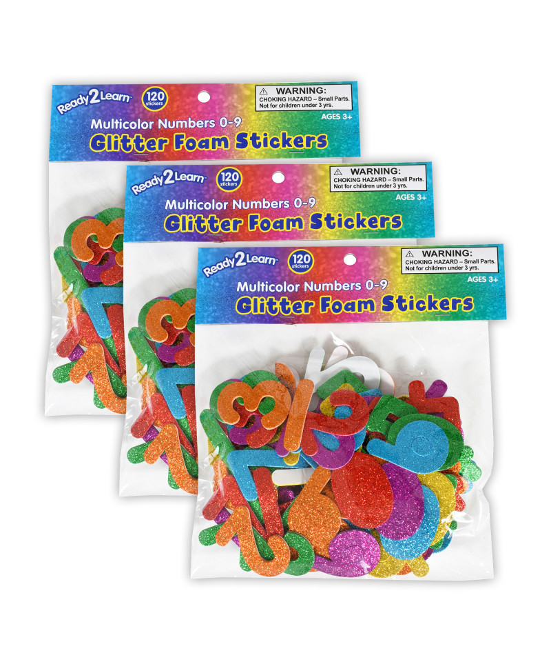 Create sparkly scenes and personalize your stuff with foam number stickers! Each sticker pack includes 120 stickers with 12 each of numbers 0-9. Colors include orange, red, yellow, green, blue and purple. These mess-free stickers don't require glue and are easy for children to peel and stick. Number stickers are a hands-on, visual tool to practice number recognition and counting. Children can also practice early addition and subtraction. Use these glitter stickers to personalize greeting cards, posters, notebooks and more! Crafting with stickers contributes to the development of children's fine motor skills, hand-eye coordination and creative expression. These thick EVA foam stickers are easy to hold and manipulate. The stickers are non-toxic. For ages 3+. Largest size: 1.6"L x 1.5"W. Each pack includes 120 stickers. Sold as 3 packs for a total of 360 stickers.