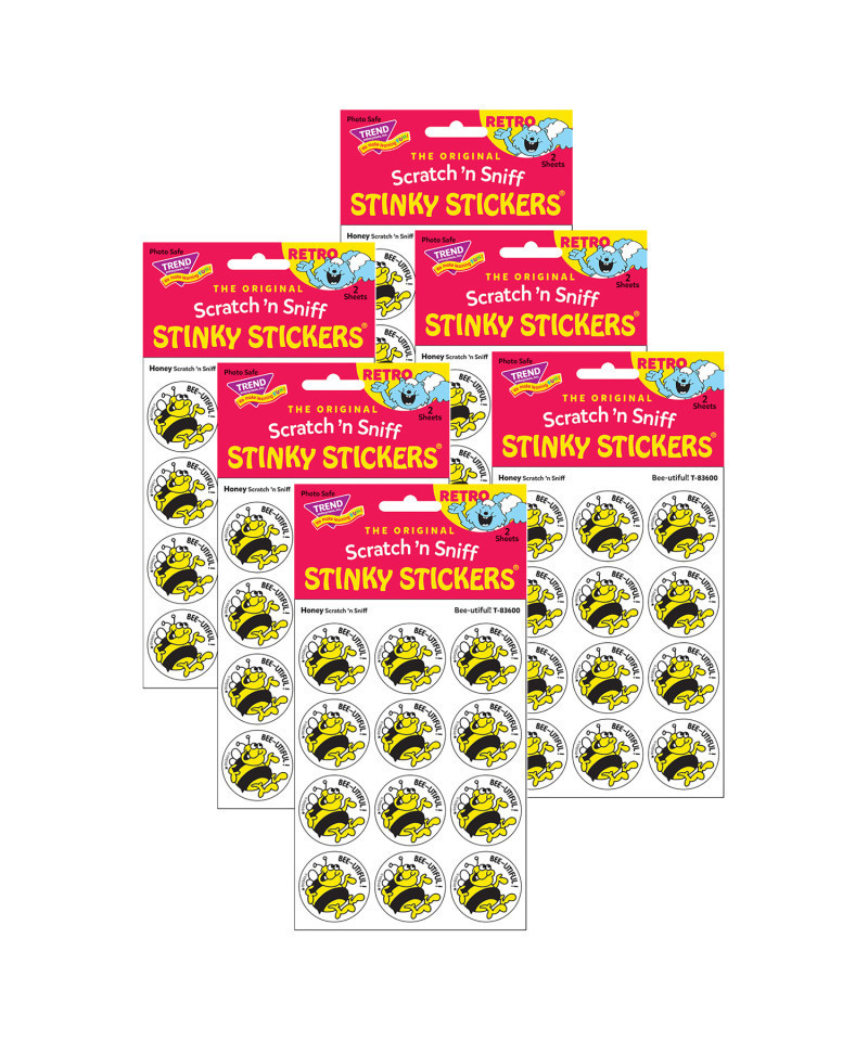 Get a whiff of this Bee-utiful!, honey-scented sticker! TREND Scratch 'n Sniff Stinky Stickers from the '80s are BACK! Fun to collect, trade, and celebrate accomplishments and special occasions. Collectors will be happy to spot the star symbol to distinguish TREND Retro Stinky Stickers from those printed in the 1980s. Each pack includes 24 stickers on 2 sheets. Sold as 6 packs for a total of 244 stickers.