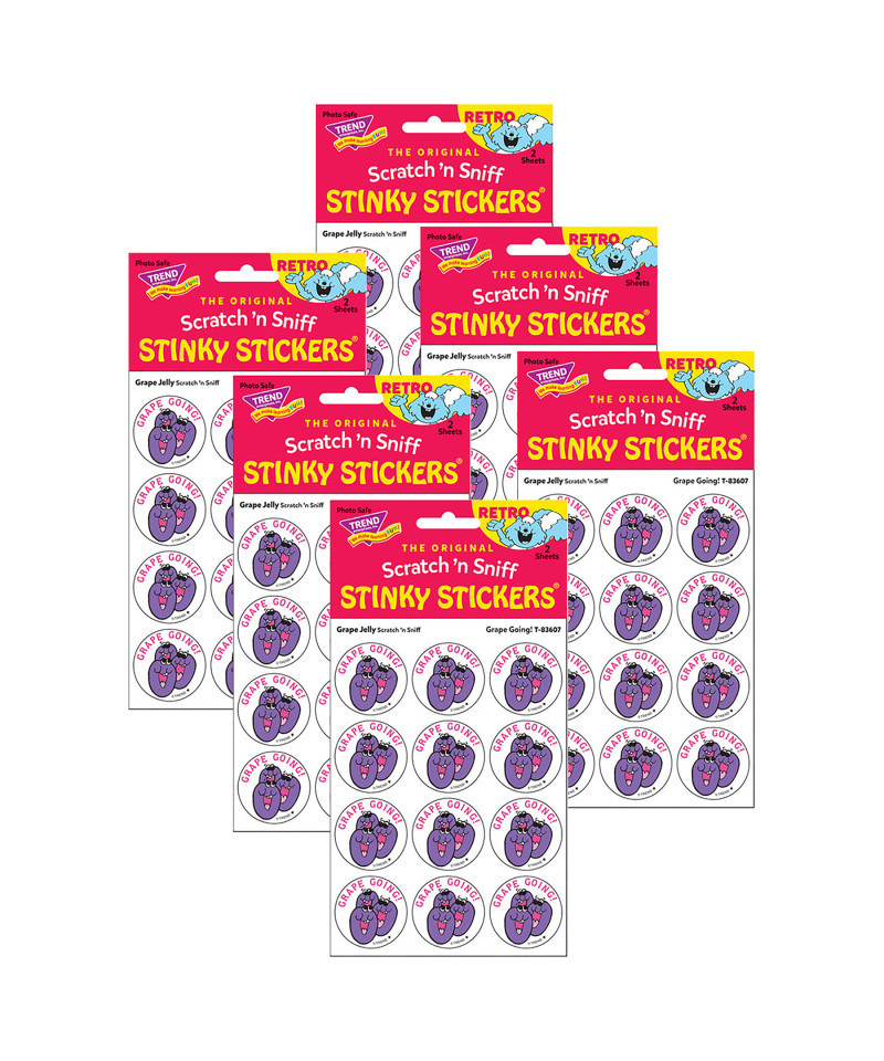 Get a whiff of this Grape Going!, grape jelly-scented sticker! TREND Scratch 'n Sniff Stinky Stickers from the '80s are BACK! Fun to collect, trade, and celebrate accomplishments and special occasions. Collectors will be happy to spot the star symbol to distinguish TREND Retro Stinky Stickers from those printed in the 1980s. Each pack includes 24 stickers on 2 sheets. Sold as 6 packs for a total of 244 stickers.