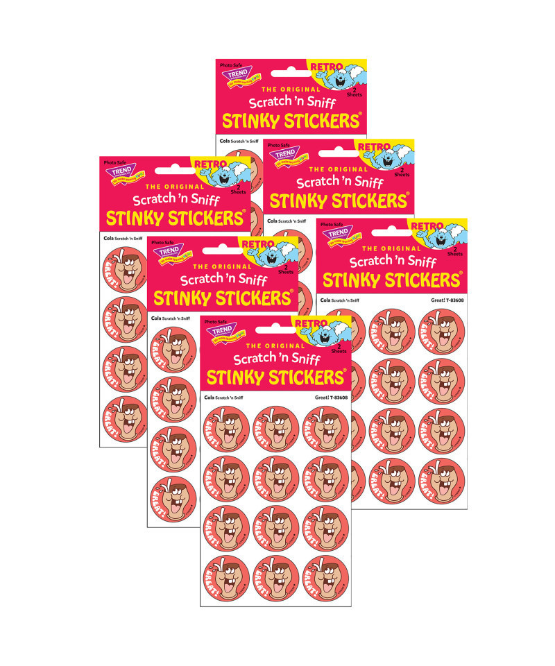 Get a whiff of this Great!, cola-scented sticker! TREND Scratch 'n Sniff Stinky Stickers from the '80s are BACK! Fun to collect, trade, and celebrate accomplishments and special occasions. Collectors will be happy to spot the star symbol to distinguish TREND Retro Stinky Stickers from those printed in the 1980s. Each pack includes 24 stickers on 2 sheets. Sold as 6 packs for a total of 244 stickers.