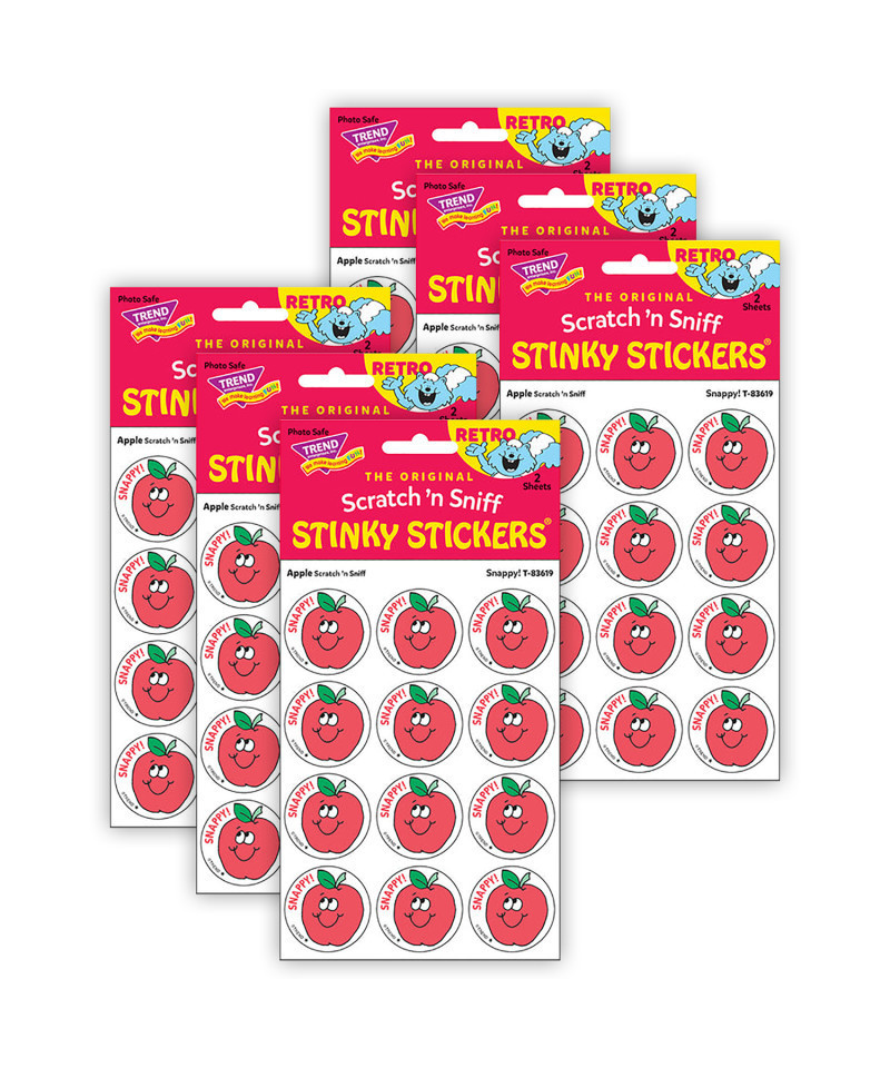 Get a whiff of this Snappy, apple-scented sticker! TREND Scratch 'n Sniff Stinky Stickers from the '80s are BACK! Fun to collect, trade, and celebrate accomplishments and special occasions. Collectors will be happy to spot the star symbol to distinguish TREND Retro Stinky Stickers from those printed in the 1980s. Each pack includes 24 stickers on 2 sheets. Sold as 6 packs for a total of 244 stickers.