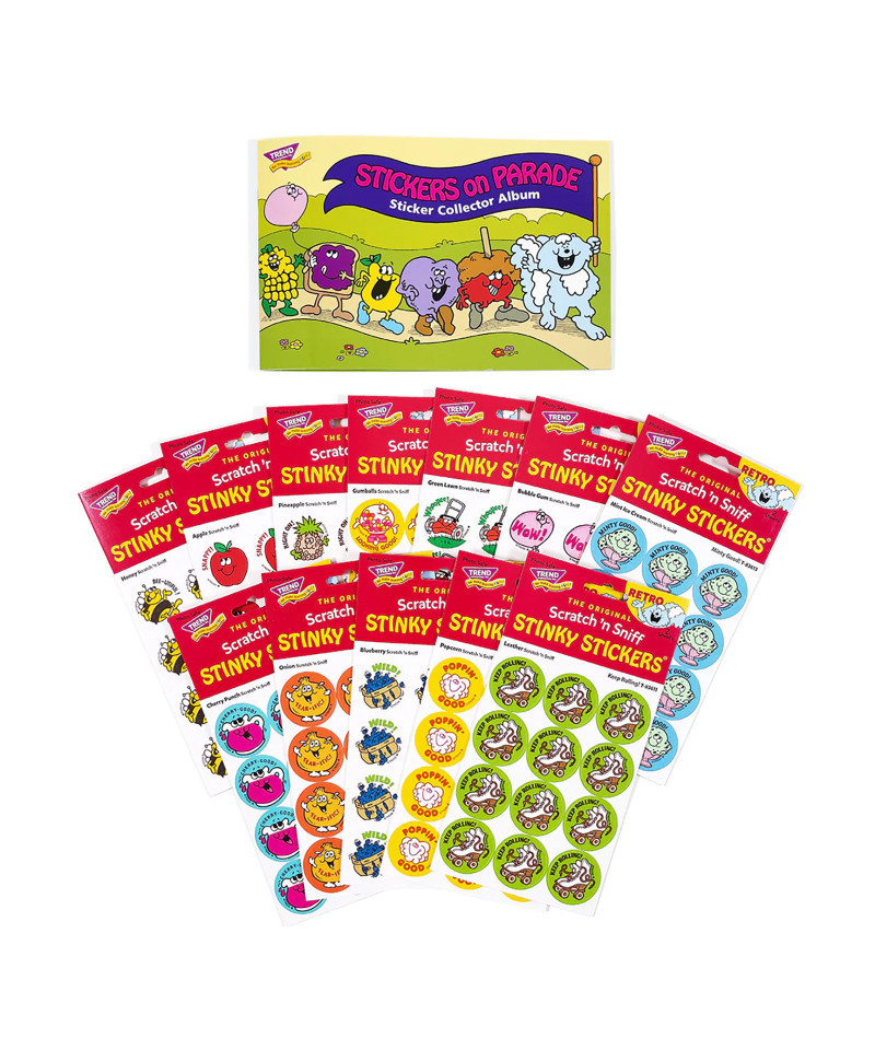 Get a whiff of this! TREND Scratch 'n Sniff Stinky Stickers from the 1980s are BACK and they are SCENT-SATIONAL! This set includes one pack each of these inaugural 12 Retro Stinky Stickers® titles: Bee-utiful!, Cherry-Good!, Keep Rolling!, Looking Good!, Minty Good!, Poppin' Good, Right On!, Snappy!, Tear-ific!, Whoopee!, Wild!, and Wow!; plus one Stickers On Parade Sticker Collector Album. Each sticker pack includes 2 sheets / 24 stickers, measuring 1-1/4" diameter. Fun to collect, trade, and share. On the stickers, collectors will be happy to spot the star that distinguishes these titles from those printed by TREND in the 1980s.
