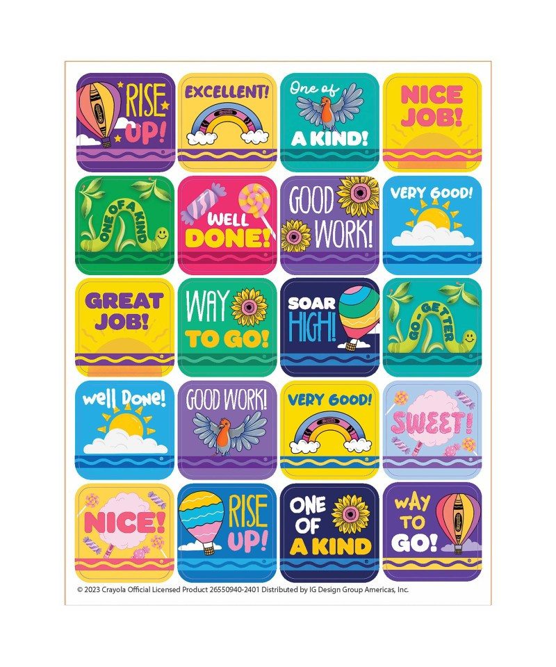 The choices are endless with Eureka stickers. There are hundreds of ways to utilize this versatile format at home or in the classroom. Each sticker measures 1" x 1". Each pack contains 120 stickers. Help amplify your students' learning environment with the easily recognizable look of Crayola®.
