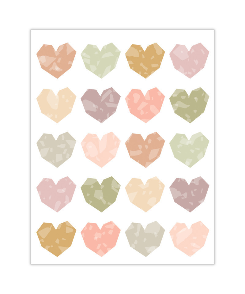 Elevate your projects with the modern charm of our Terrazzo Tones Hearts sticker set, where a mosaic of vibrant hues and contemporary patterns adorns heart-shaped delights, infusing each creation with a stylish blend of sophistication and artistic flair. Each sticker is acid-free & lignin-free and measures about 2-1/2" x 1/2". Each pack includes 120 stickers in 10 colors.