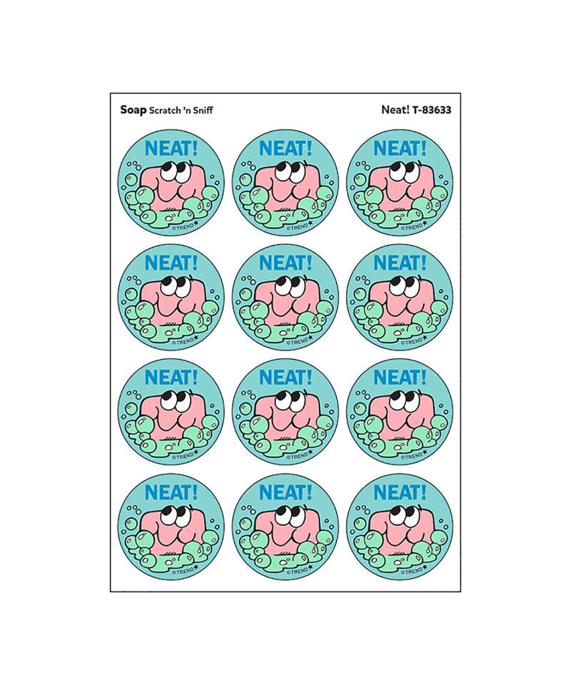 Get a whiff of this Neat!, soap-scented sticker! TREND Scratch 'n Sniff Stinky Stickers® from the '80s are BACK! Fun to collect, trade, and celebrate accomplishments and special occasions. Collectors will be happy to spot the ˜… to distinguish TREND Retro Stinky Stickers® from those printed in the 1980s. Each sticker 1.25" diameter. Each pack includes 24 stickers on 2 sheets in 1 design.