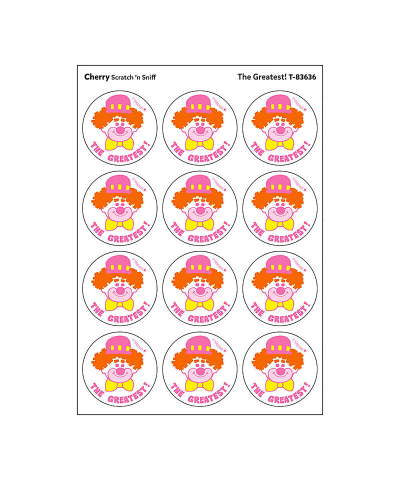 Get a whiff of this The Greatest!, cherry-scented clown sticker! TREND Scratch 'n Sniff Stinky Stickers® from the '80s are BACK! Fun to collect, trade, and celebrate accomplishments and special occasions. Collectors will be happy to spot the ˜… to distinguish TREND Retro Stinky Stickers® from those printed in the 1980s. Each sticker 1.25" diameter. Each pack includes 24 stickers on 2 sheets in 1 design.