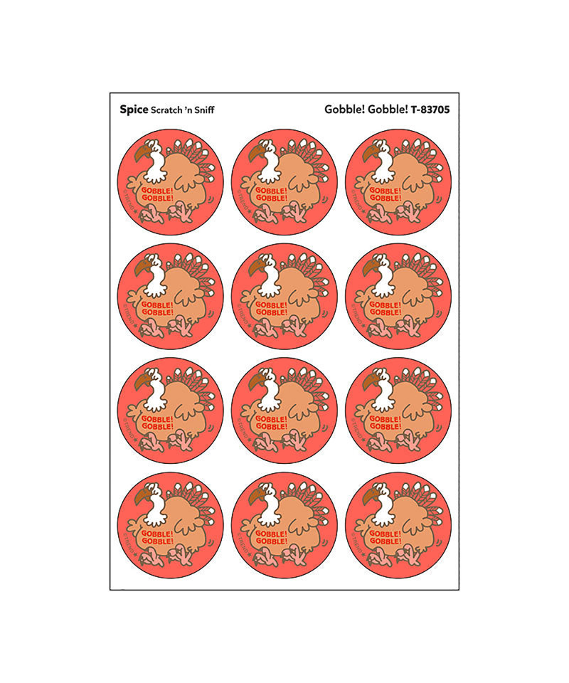 Get a whiff of this Gobble! Gobble!, spice-scented turkey sticker! TREND Scratch n Sniff Stinky Stickers from the '80s are BACK! Fun to collect, trade, and celebrate accomplishments and special occasions. Collectors will be happy to spot the ˜… to distinguish TREND Retro Stinky Stickers® from those printed in the 1980s. Each sticker 1.25" diameter. Each pack includes 24 stickers on 2 sheets in 1 design.