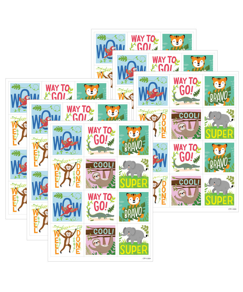 Reward students with these Jungle Friends Rewards Stickers. Inspirational sayings, such as "Well Done," "Way to Go!," and "Bravo," are paired with friendly jungle animals to create motivating reward stickers that will make students feel proud of their efforts. Coordinates with Jungle Friends products. Measures approximately 1-1/2" x 1-1/2". Each pack includes 60 stickers. Sold as 6 packs for a total of 360 stickers.