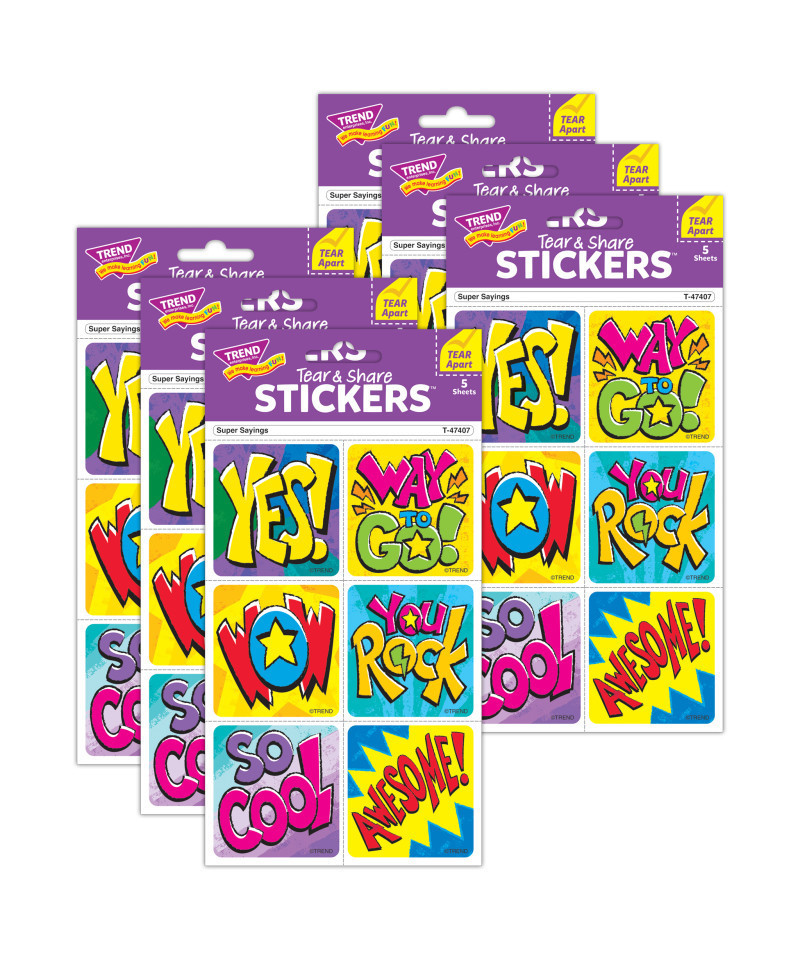 Sharing your love of stickers is now simpler and more fun with TREND Tear & Share Stickers. Just tear apart at the perforated line to separate a sticker from the rest of the sheet - no scissors needed, and the recipient can place their sticker wherever they like! Perfect for motivation, party favors, rewards, collecting, and more. Stickers measure 1-7/8" x 1-15/16". Nontoxic, acid-free, and photo safe. Each pack includes 30 stickers. Sold as 6 packs for a total of 180 stickers.
