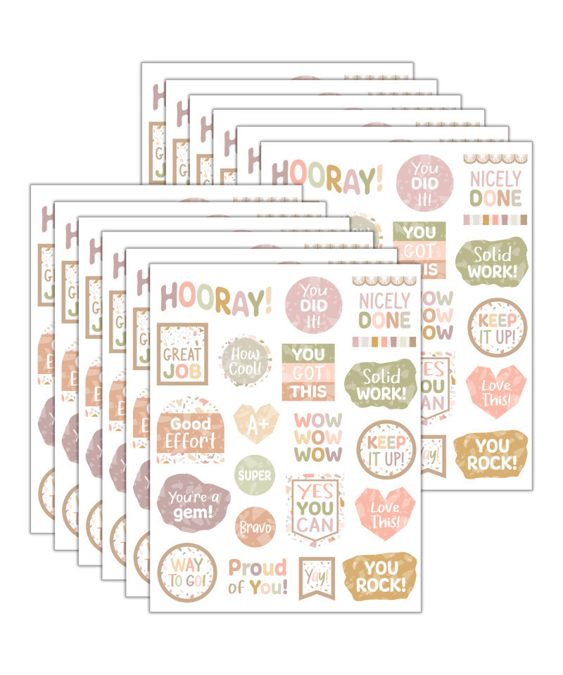 Immerse your projects in a positive vibe with our Terrazzo Tones sticker set, where a stylish blend of vibrant hues frames encouraging messages. Each sticker is acid-free & lignin-free and measures about 2-1/2" x 1/2". Each pack includes 120 stickers in 20 designs. Sold as 12 packs for a total of 1440 stickers.